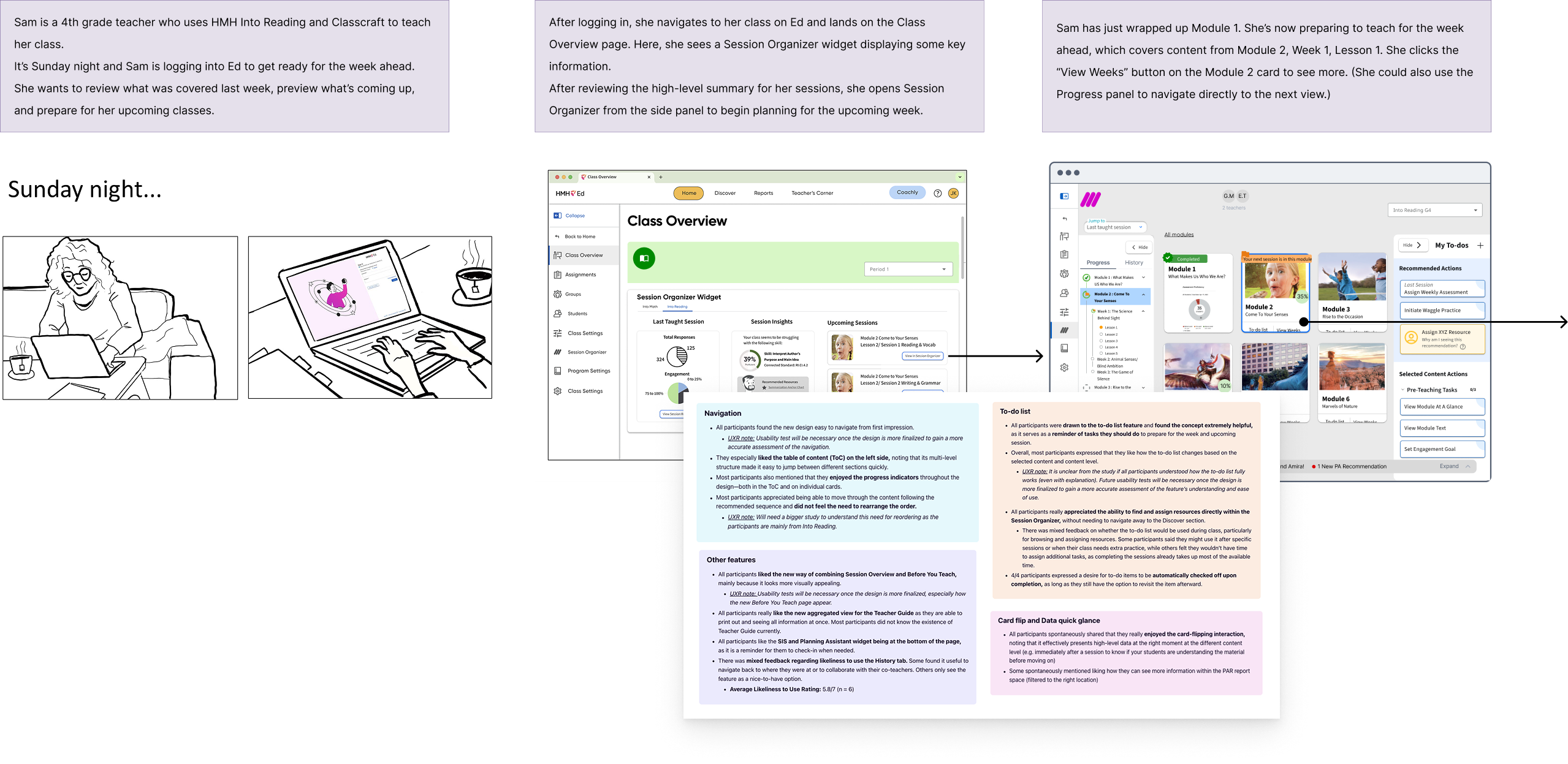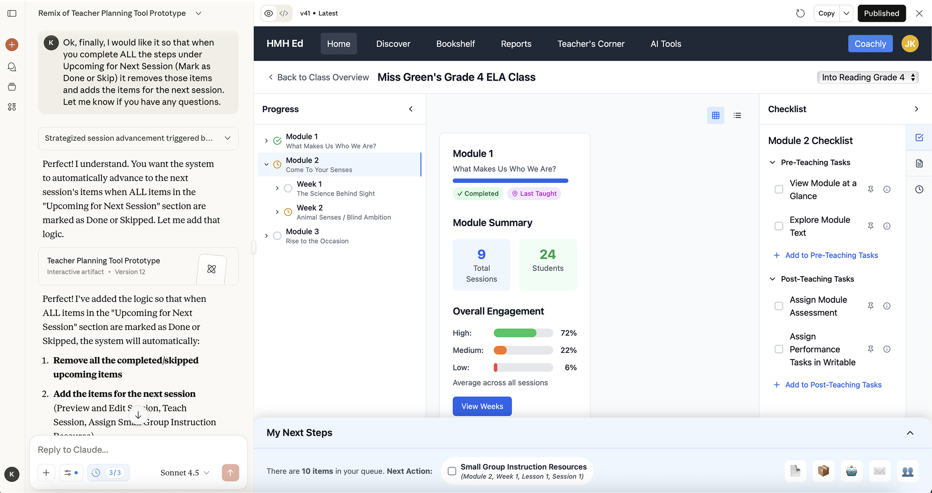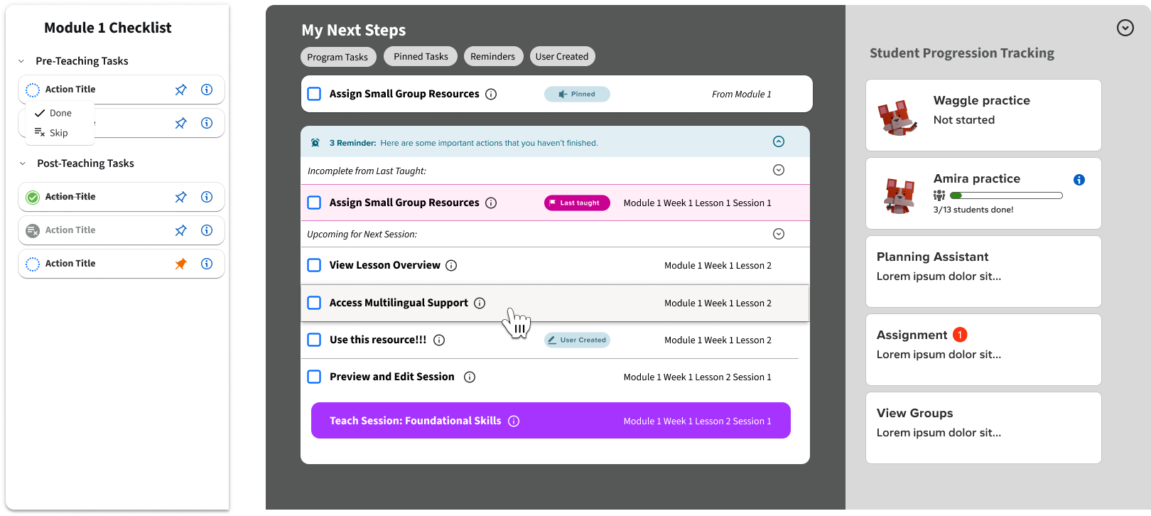 To take all of this from storyboards and wireframes into a testable artifact we decided to try out a new development tool that has since taken over the industry: AI. Figma prototyping can be fairly tedious and clumsy, particularly when conditionals are involved and you want to highlight complex interactions. Prototyping with AI allowed us, with a bit of trial and error, to develop a more robust, feature-rich testing artifact. Using this, teachers were able to test complex interactions between navigation and task lists, such as skipping sessions (and thus skipping actions), which updated their dynamic command center queue, which updated their progression indicators. If anything, it was a bit too robust, which sometimes had the negative effect of seeming like a finished product.