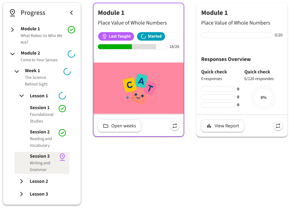 Another key component was giving teachers obvious visual indicators of where they were within the content and how much of the content they had completed. A learning product is a complex system of modules, units, lessons, sessions, resources, etc. It is easy to get lost in the weeds. By providing visual indicators of "Last Taught" as well as completion status on both the cards and a useful (and collapsible, for focus) side navigation, we always grounded the user in their own progression of the content. This allowed our experienced user to chart their own path, but it was just as easy for them to go right back to where they left off because of the visual reinforcement we provided.
