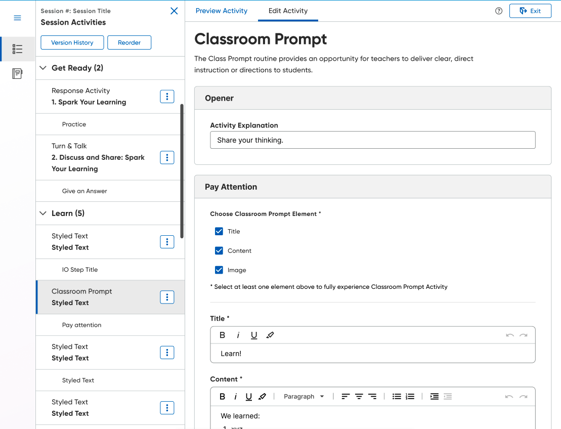 The first, which we called In-Player, was an evolution of the existing approach. Teachers would edit content directly within the session player view but lean on AI-assisted augmentation to do more of the heavy lifting. It preserved the original mental model (here is your session, modify it), but also preserved the original versioning problem.