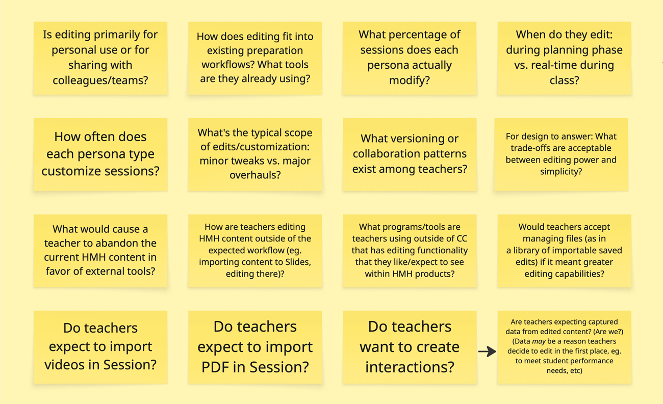 We brought in our research team and asked them to do three things: surface any existing feedback on the current editing experience, pull any research that had informed previous editing decisions, and gather relevant external knowledge on teacher workflows.