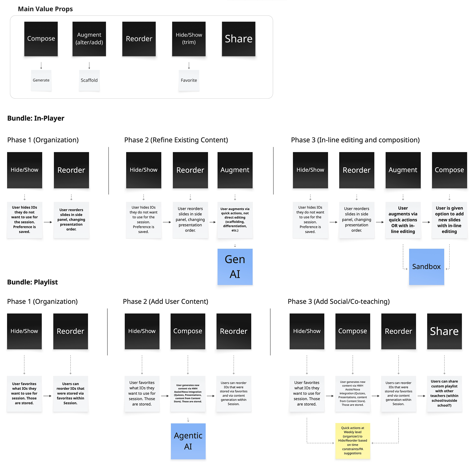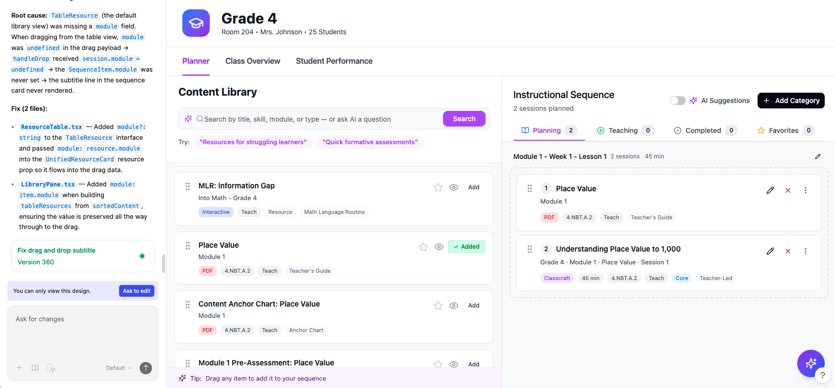 As the roadmap was being paused for realignment, our product owner incorporated the Playlist concept into a platform vision prototype built in Figma Make to orient incoming leadership. In that prototype, the content library sits alongside the instructional sequence — teachers pick from it, build their playlist, and teach from what they've curated, with the original content always available but out of the way. Our concept became the backbone of the platform's future vision gameplan, not just a solution to a specific editing gap.