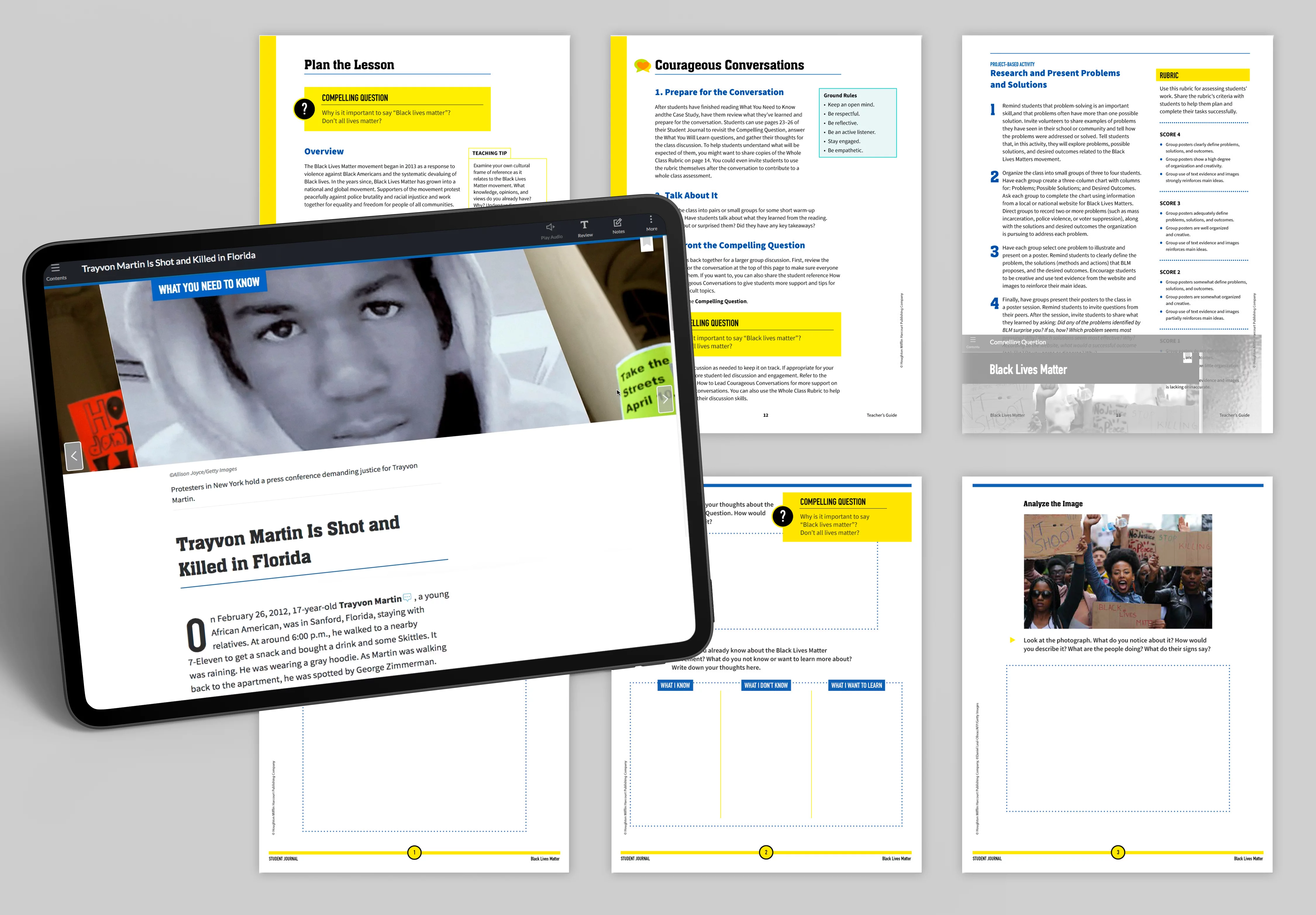 HMH knew it had to respond to this significant moment and saw it as an opportunity to address an embarrassing omission in its educational library, but the moment was happening quickly, news changing frequently, and for a traditional publishing company that kind of speed is difficult to address. We knew we had a narrow window, so a small tiger team of individuals was tasked to quickly develop a series of print and digital modules that not only covered the current protests but the sordid history of racial politics in America. We partnered with Tyrone Howard, educator and founder of the Black Male Institute, in order to ensure we were being respectful of the moment.